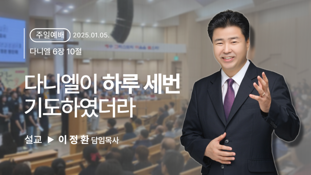 주일설교다니엘이 하루 세 번 기도하였더라 수원성결교회 / 2025년 01월 05일 다니엘이 이 조서에 왕의 도장이 찍힌 것을 알고도 자기 집에 돌아가서는 윗방에 올라가 예루살렘으로 향한 창문을 열고 전에 하던 대로 하루 […]