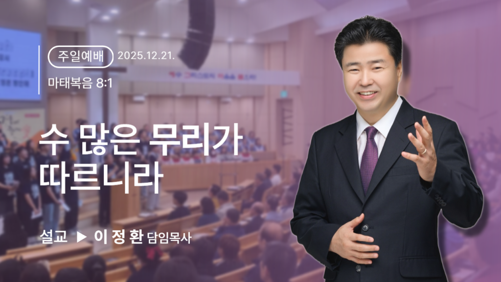 주일 설교 주일설교 지혜롭고 총명한 마음을 주노라 2025년 12월 28일 주일설교 수 많은 무리가 따르니라 2025년 12월 21일 주일설교 베들레헴 에브라다야 2025년 12월 14일 주일설교 많은 사람의 대속물로 주려 함이라 인자가 온 것은 섬김을 받으려 함이 아니라 도리어 섬기려 하고 자기 목숨을 많은 사람의 대속물로 주려 함이니라 마가복음 10:45 2025년 12월 07일 주일설교 더 풍성히 얻게 하려는 것이라 도둑이 오는 것은 도둑질하고 죽이고 멸망시키려는 것뿐이요 내가 온 것은 양으로 생명을 얻게 하고 더 풍성히 얻게 하려는 것이라 요한복음 2025년 11월 30일 주일설교 열매 맺는 백성이 받으리라 그러므로 내가 너희에게 이르노니 하나님의 나라를 너희는 빼앗기고 그 나라의 열매 맺는 백성이 받으리라 마태복음 21:43 (신약 37면) 예수 그리스도께서 2025년 11월 23일 주일설교 열매를 맺어 자라는 도다 3 우리가 너희를 위하여 기도할 때마다 하나님 곧 우리 주 예수 그리스도의 아버지께 감사하노라4 이는 그리스도 예수 안에 너희의 믿음과 모든 성도에 2025년 11월 09일 주일설교 많은 열매를 맺느니라 내가 진정으로 진정으로 너희에게 말한다. 밀알 하나가 땅에 떨어져 죽지 않으면 한 알 그대로 있고, 죽으면 열매를 많이 맺는다. (요한복음 2025년 11월 02일 주일설교 모든 백성이 아멘 할지니라 이 율법의 모든 말씀을 실행치 아니하는 자는 저주를 받을 것이라 할 것이요 모든 백성은 아멘 할지니라 (신명기 27:26) 여호와 하나님께서는 2025년 10월 26일 설교 더 보기